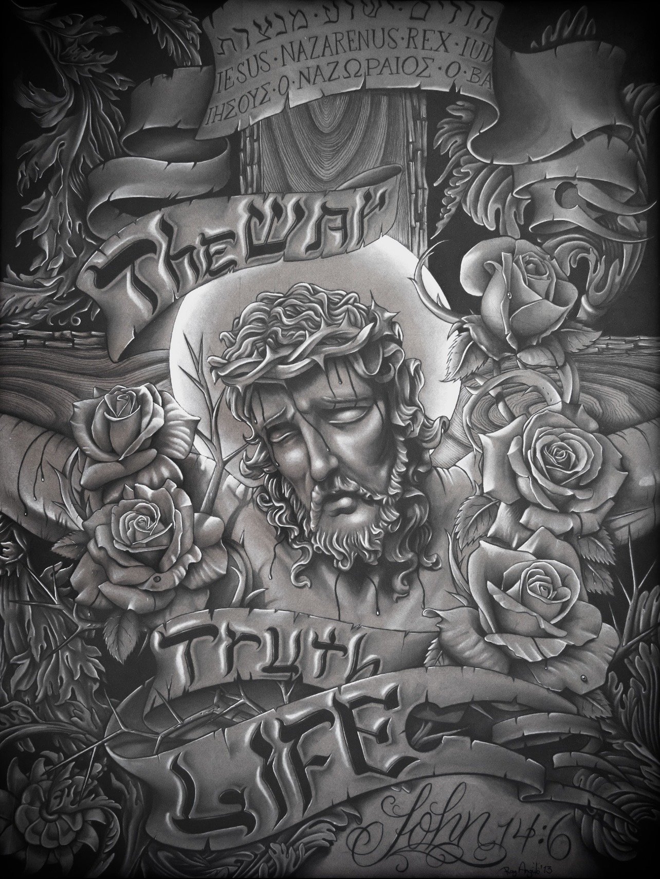 My drawings and paintings explore sacred imagery through the language of classical composition and black and grey realism.